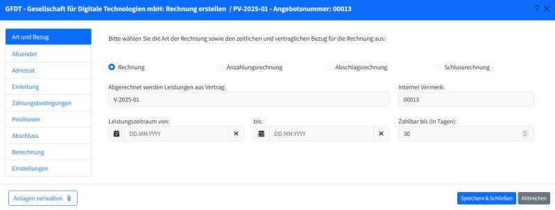 - Gesetzeskonform: ede neue Rechnung wird automatisch als normkonforme ZUGFeRD-Datei erzeugt (E-Rechnungspflicht erfüllt).